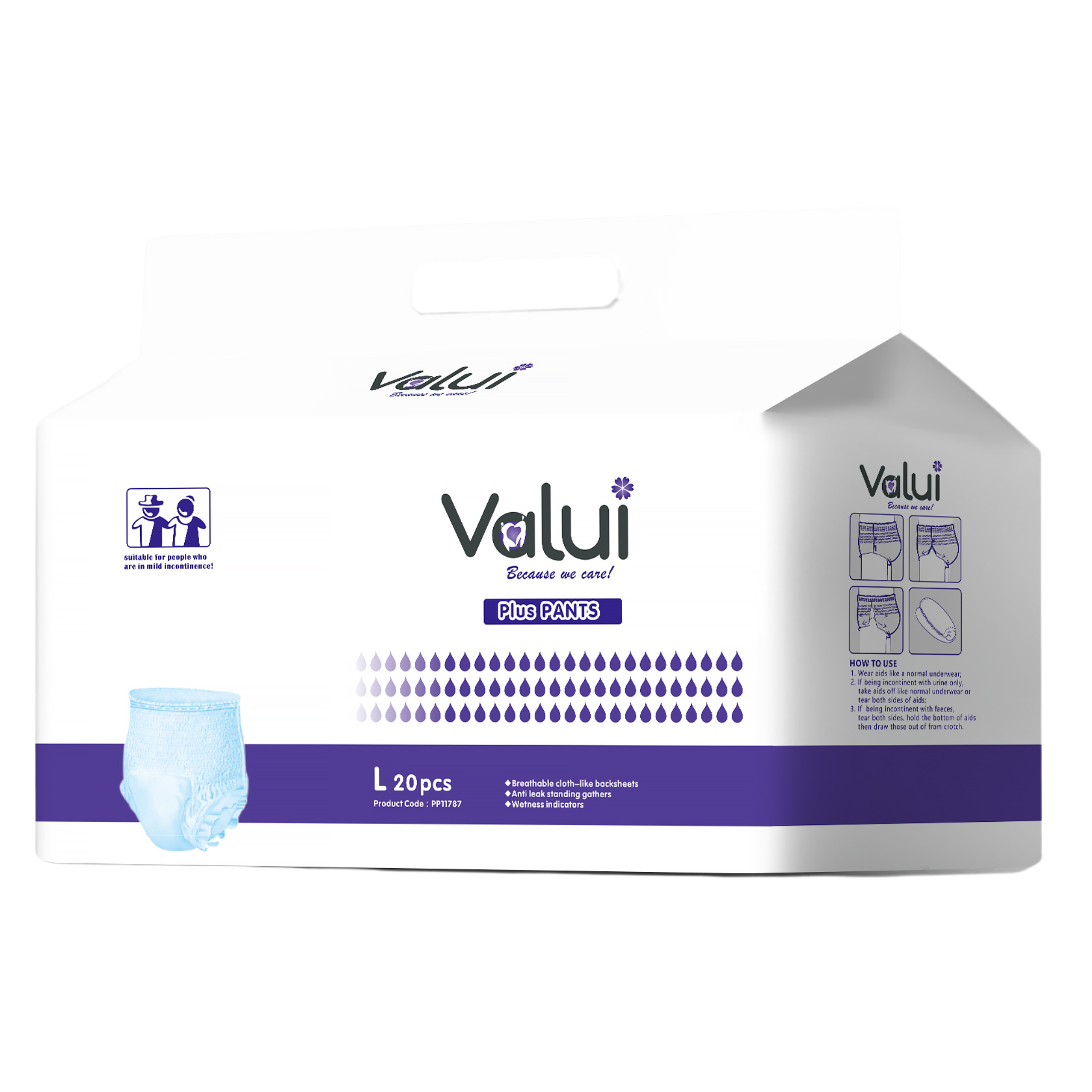 Valui Pants are a pull-up style aid designed to be worn just like normal underwear. To accommodate comfort, Valui Pants are available in two categories: Maxi (higher absorbency) & Plus Pants.
