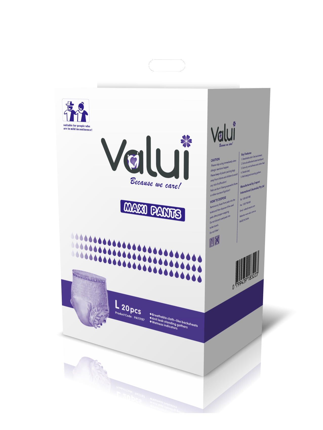 Valui Pants are a pull-up style aid designed to be worn just like normal underwear. To accommodate comfort, Valui Pants are available in two categories: Maxi (higher absorbency) & Plus Pants.